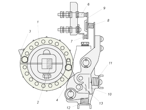 Контактная рейка состоит из набора подвижных контактов поз. 8- 9, отключающих рычагов поз.10 и пружин поз.11 и 12. Включающий кулачок поз. 4 при вращении барабана доходит до ролика поз. 13, и нажимая на него, поворачивает палец контактный поз.8. Подвижный контакт поз.9 замыкает цепь. Отключающий рычаг поз. 10 под действием пружины поз. 12 входит в вырез пальца контактного поз.8 и удерживает последний во включенном состоянии. При дальнейшем вращении барабана отключающий кулачек поз. 3 подходит к ролику поз.13 и, отключающего рычага поз. 10 и, нажимая на него, отключает последний. При этом отключающий рычаг поз. 10, выходя из выреза поворотного пальца поз.8 освобождает последний, который поворачиваясь под действием пружины поз.11 вокруг своей оси, размыкает контакты по 6 и 7. Нормально на каждой шайбе барабана устанавливается по одному включающему и одному отключающему кулачку. Допускается установка до 3-х включающих и 3-х отключающих кулачков, при этом скорость циклов "включено-отключено" не превышает 1800 в час.