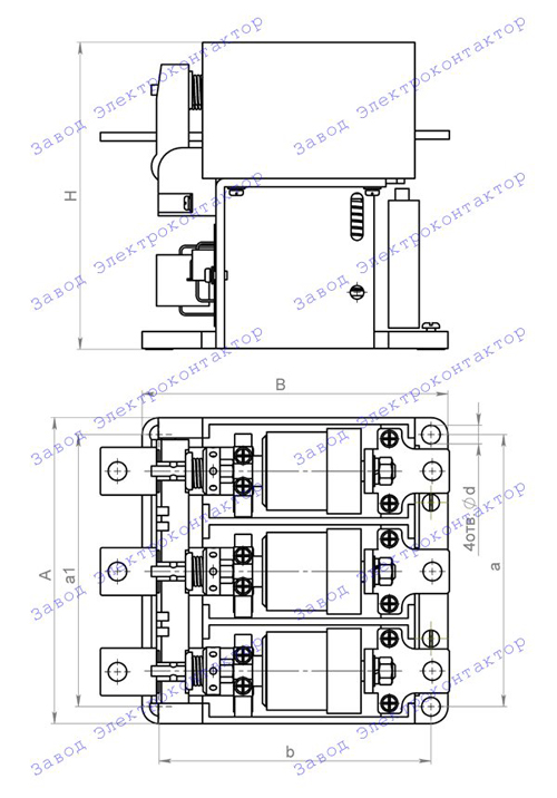 Внешний вид, габаритные, установочные и присоединительные размеры контакторов вакуумных серии КВ отражены в таблице и на чертеже: