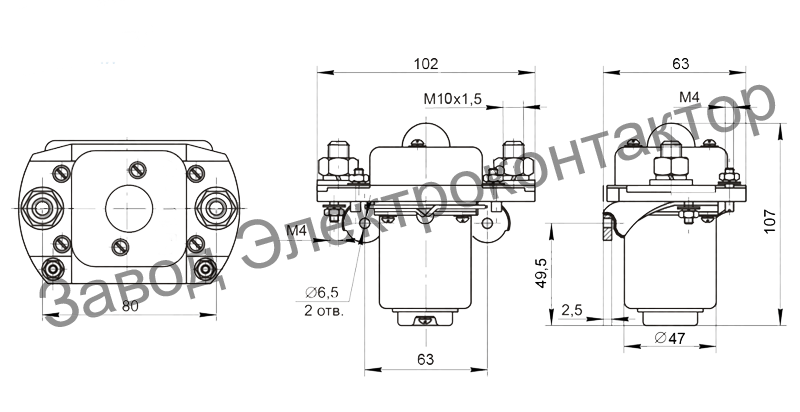 корпус изделия снабжен стойкой крепления с предусмотренными крепежными отверстиями, при помощи которых легко произвести крепление контактора на винты, присоединение проводников при этом является передним.